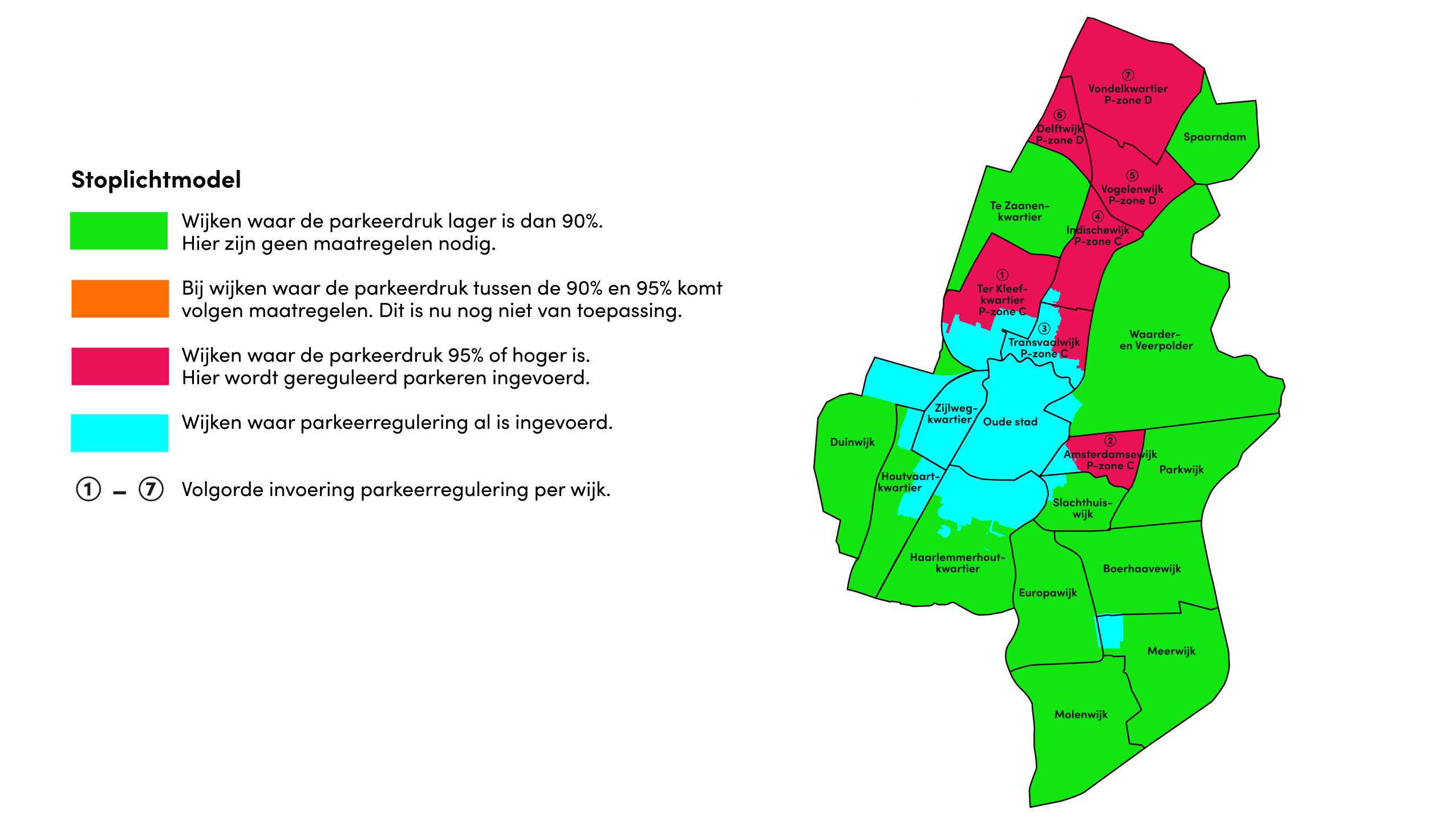 De invoering van parkeermaatregelen gebeurt op basis van een 'stoplichtmodel', dat uitgaat van de gemiddelde parkeerdruk in een wijk.