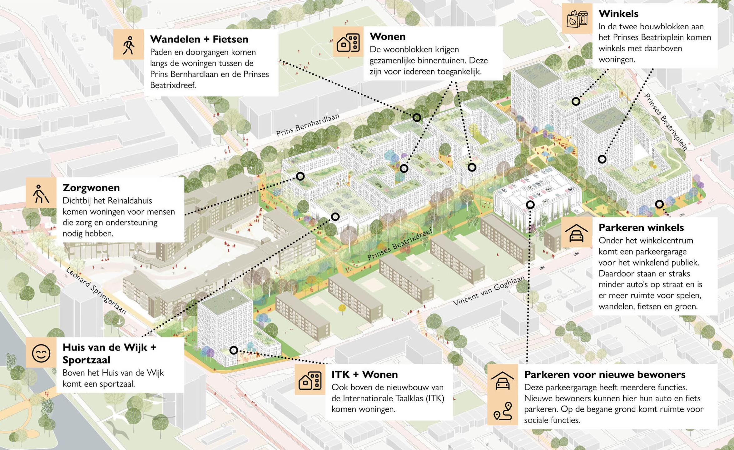 Het Prinses Beatrixplein wordt na 60 jaar vernieuwd. Woningen en appartementen, een modern winkelcentrum met parkeergarage, onderwijs en een Huis van de Wijk met sportzaal zorgen straks voor een levendige omgeving. En er komt meer ruimte voor wandelen, buiten spelen en groen.